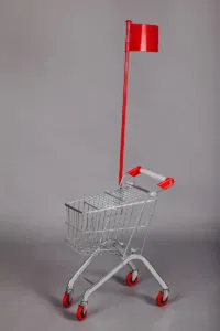 А могут выглядеть как обычные покупательские тележки, только уменьшенные до объема 20-25 л. Такие тележки оснащены флажком на длинной мачте, чтобы родители в процессе шопинга не потеряли маленького покупателя.