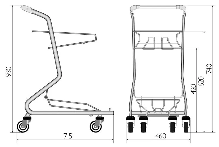 Тележка для двух покупательских корзин STB-05 позволяет соединить функции обычной покупательской тележки и покупательских корзин, что позволяет оптимизировать затраты на оборудование.